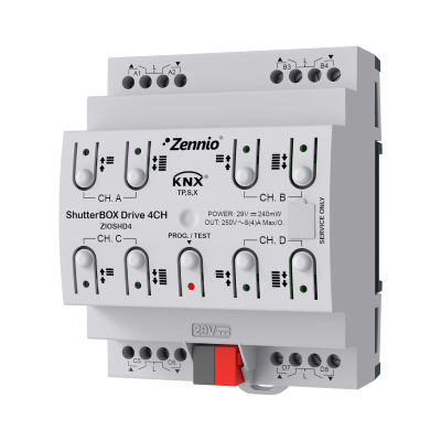 Control of blind / shutter within a KNX system a wide spectrum of system benefits, from ease of use and privacy to advanced efficiency of HVAC components by working with and against solar gain. The new ShutterBOX Drive 4CH from Zennio provides control up to 4-channel blinds / shutters with automatic travel times measurement through current detection. It includes 6 alarms per channel, a module of 20 logic functions and allows manual control of the outputs with LED status indication. Among its complete functionality, the event-driven automatic control stands out, calculating the position of the sun at each moment to be able to adjust the position of the shutter and the slats. It is compatible with KNX Secure.