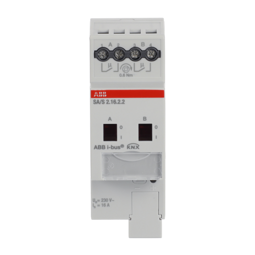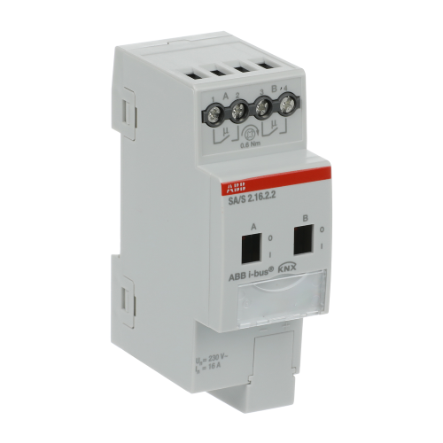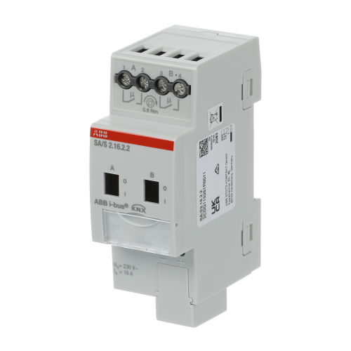 The switch actuator uses potential free contacts to switch 2 independent electrical loads via the ABB i-bus®. Manual operation and display of the switching state of the contacts. The 16 A device is especially suited for resistive loads.